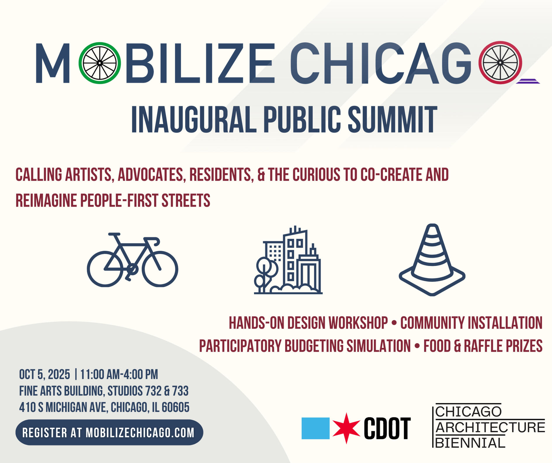 Doors open at 10:30am | Program runs 11:00am–4:00pmMore than a traditional conference, the Mobilize Chicago Summit functions as a public intervention—blending art, civic imagination, and movement-based participation to explore people-first street design.Rooted in education, creation, and community, the half-day gathering includes:- Opening Meditation & Framing Conversation (11:00am-12:00pm)